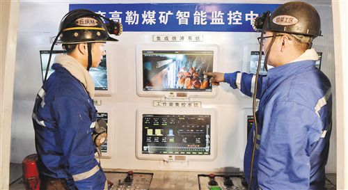 在山東能源淄礦集團巴彥高勒煤礦綜采工作面智能化集控中心,6臺防爆電腦清晰顯示著工作面所有支架的壓力及狀態(tài)、采煤機的運行參數(shù)、煤壁及支架視頻影像。它與地面集控中心的顯示器相連,可以在地面控制井下300米長工作面上的所有設(shè)備。職工“礦三代”趙昌圣點動鼠標(biāo),屏幕中采煤機滾筒迅速打開噴霧,連接運輸機的順槽皮帶輸送機也隨之運轉(zhuǎn)起來,隨著采煤機的推進,滾滾“烏金”順著順槽皮帶經(jīng)主井提升到地面。